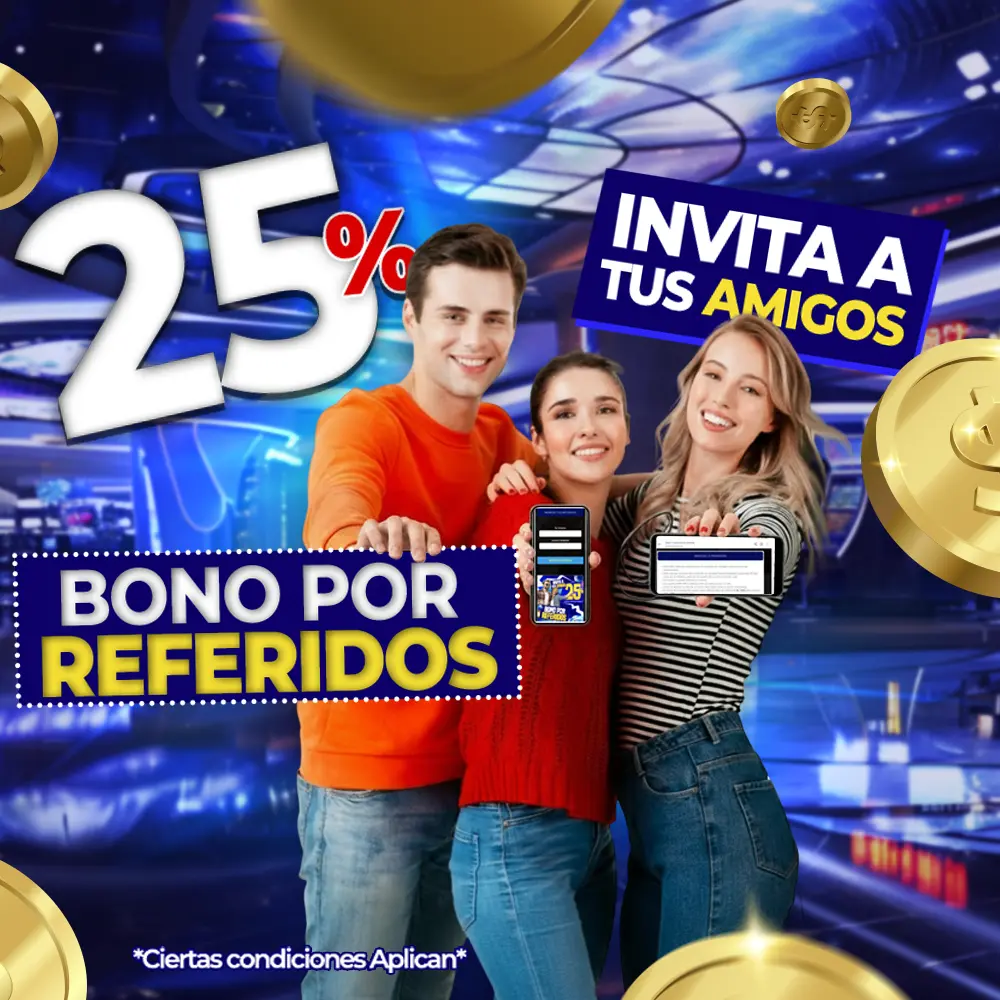 El referido es ganador del 25% adicional en su primera recarga como Bono de Bienvenida, para jugar en varios de nuestros productos.
